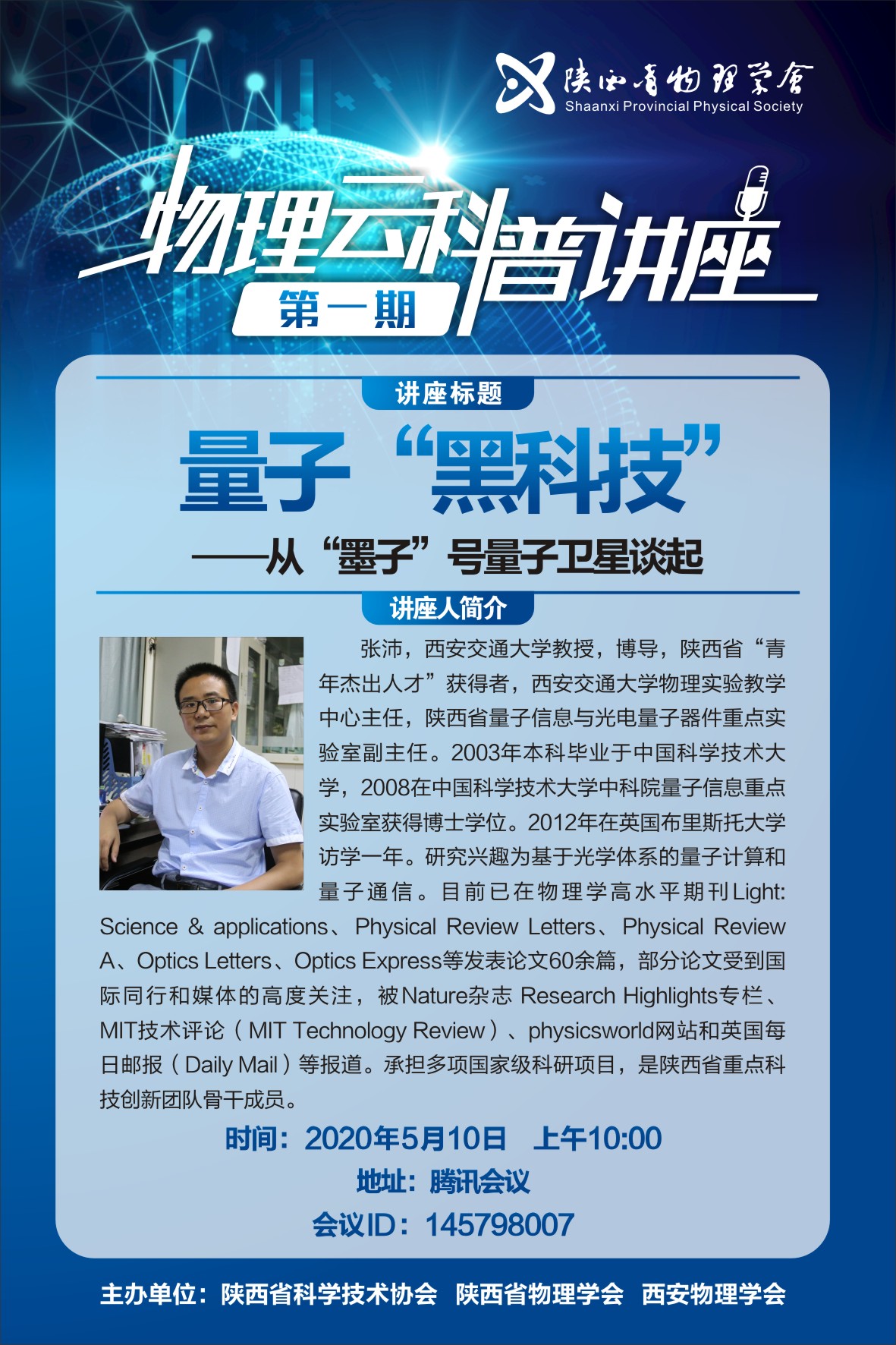 陜西省物理學會“物理云科普”講座第一期《量子“黑科技”——從“墨子”號量子衛(wèi)星談起》,將于510日上午1000,在騰訊會議開講,會議ID:145798007,主講人是西安交通大學張沛教授,歡迎各位老師和同學參會。